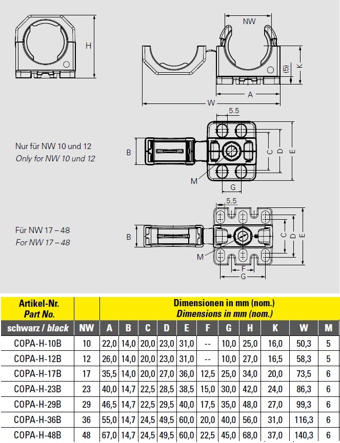 COPA-H Wellrohrhalter nach Wahl von NW10 bis NW48/50 - einteiliger Wellrohrbefestigungsclip aus speziell modifiziertem, halogenfreiem PA6 mit einer verstärkte Bodenplatte