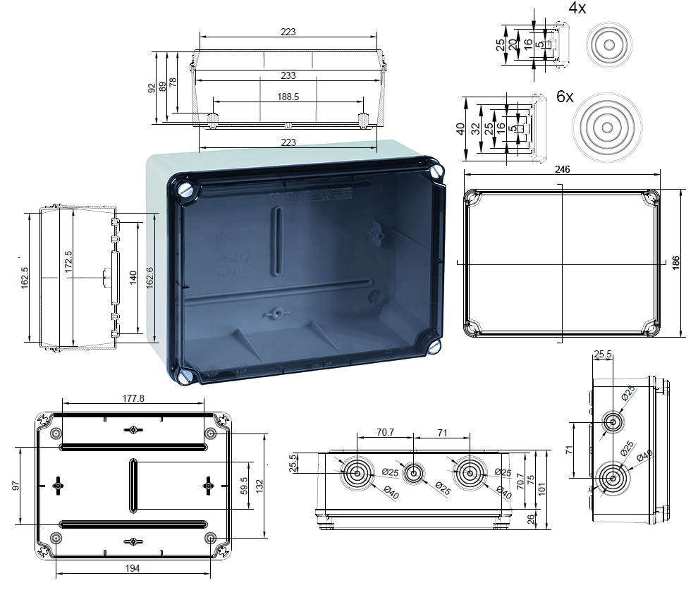 Mit elastischen Kabeldurchführungstüllen Kabeleingänge 4xM25-6xM40
